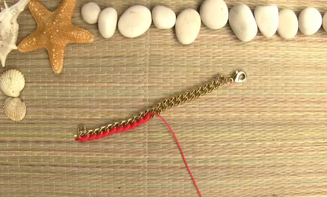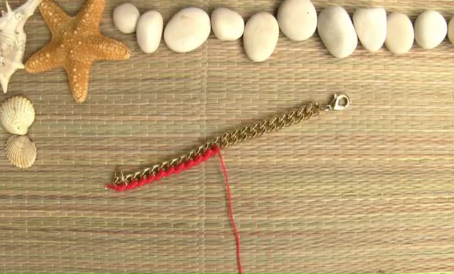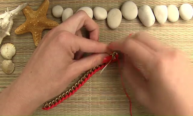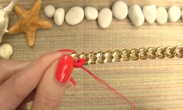 - In this wrapping part, insert the bottom of your string inside the last hole of your chain and tie one or two tight knots on it. Cut away the excess part with a scissor and start wrapping the thread around the chain by inserting the needle through the chain loop, keep it down and up again through the same loop. Like this process, you will able to cover only one side of the chain and rest the other side plain golden.