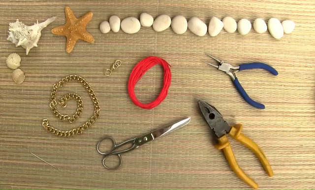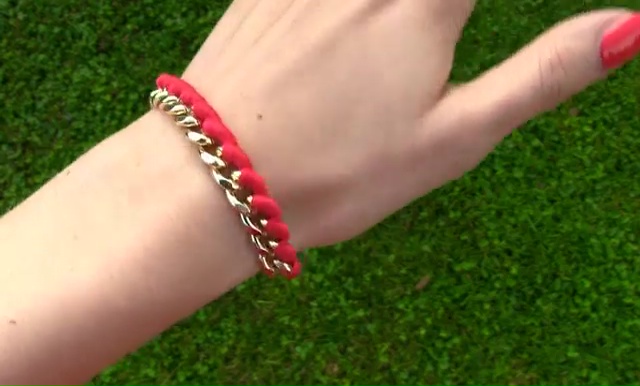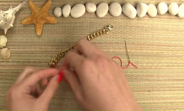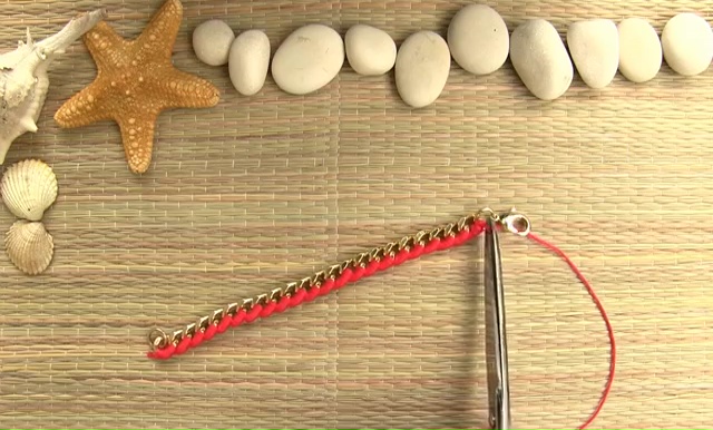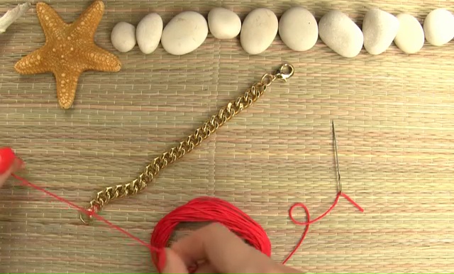 To craft this super chic bracelet, you need, a golden chain, a clasp, embroidery string in one deep shade, needle, scissor and two pliers.