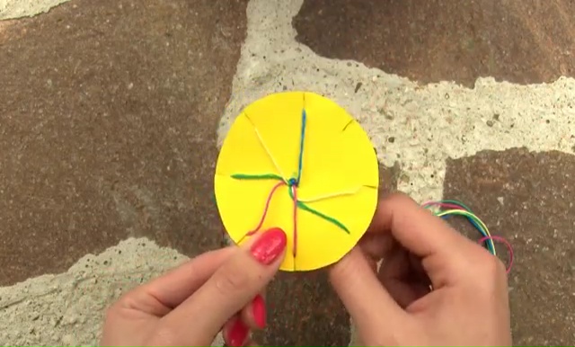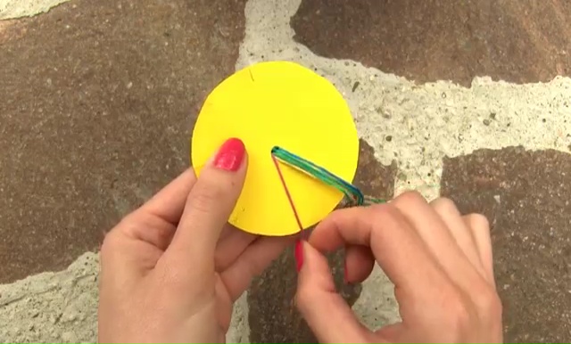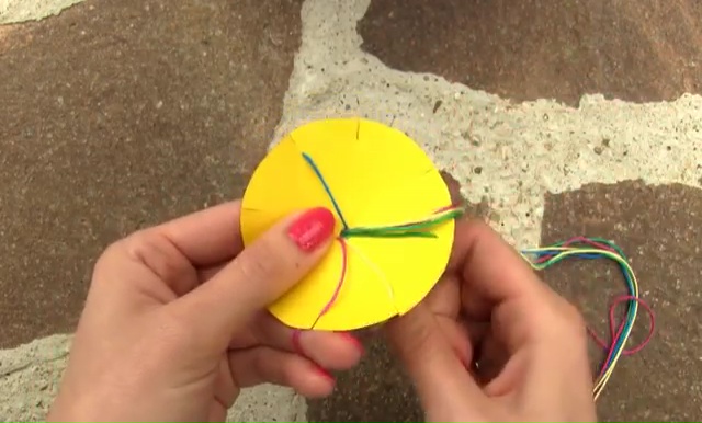 - Push the loop at the knot through the center of the cardboard, now you need to start crafting the weave of your bracelet.
