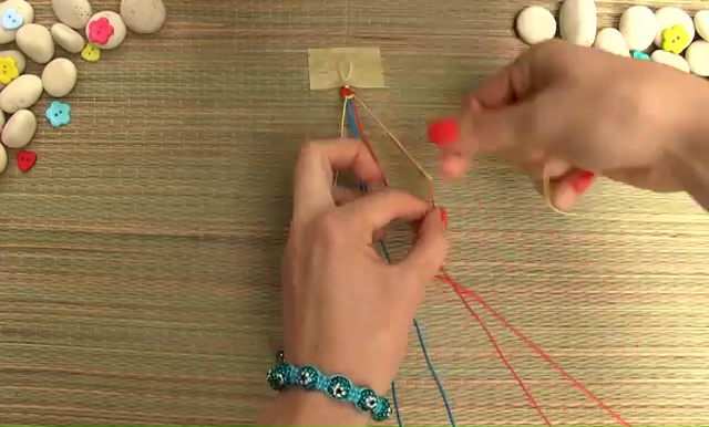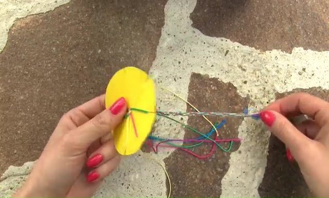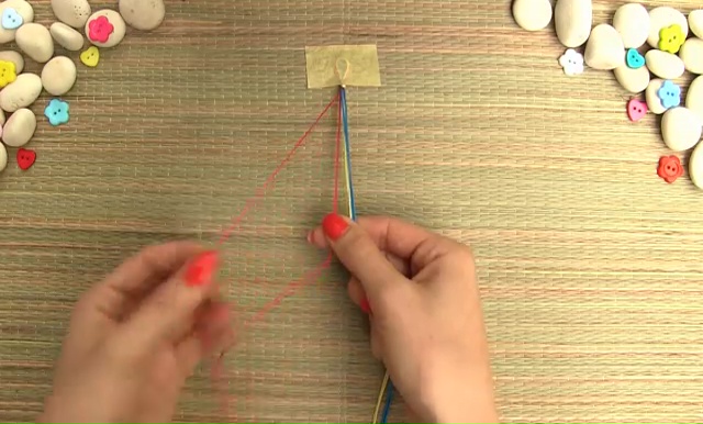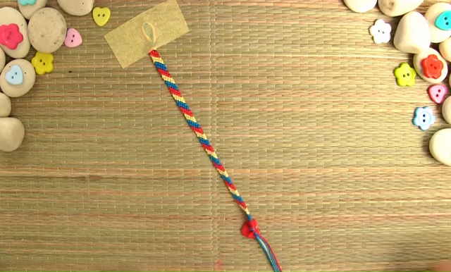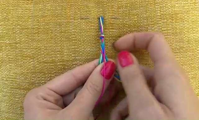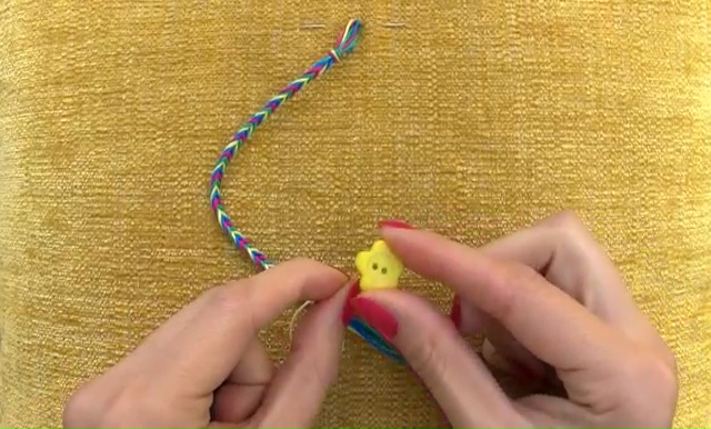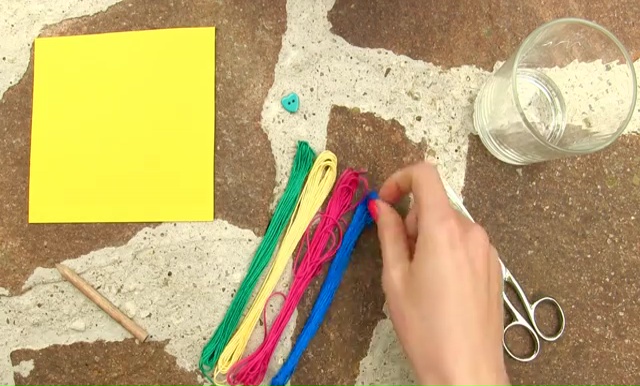 - Get four colored threads which have the measurement of 15 inches, fold the long strings in half and make a knot on the folded end. Make sure that you are leaving a little loop for the button closer while making the knot.