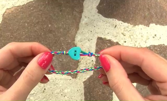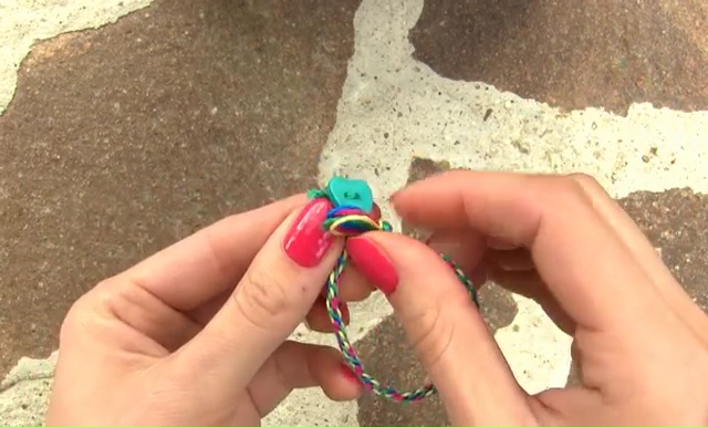 - Now, take the button, insert it on one of the string, tie some tight knots close to the bracelet and cut the extra portion away, finally, add the button to the loop and it’s all ready to wear.