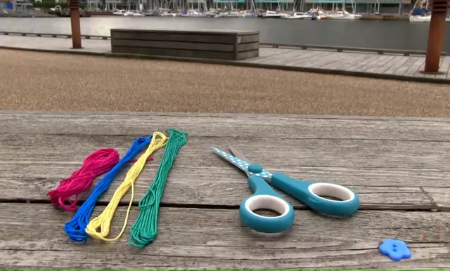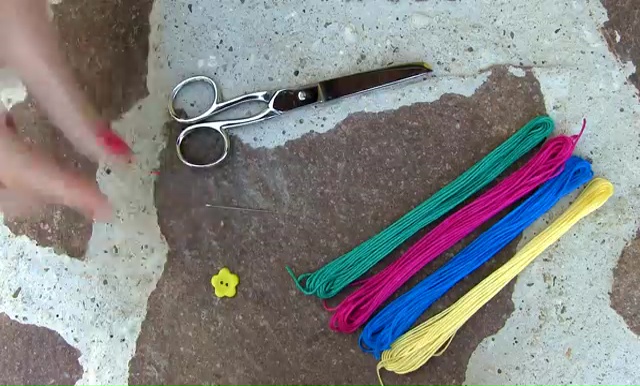 To prepare this patterned bracelet you need, 4 string colors, one scissor and one button along with a needle.