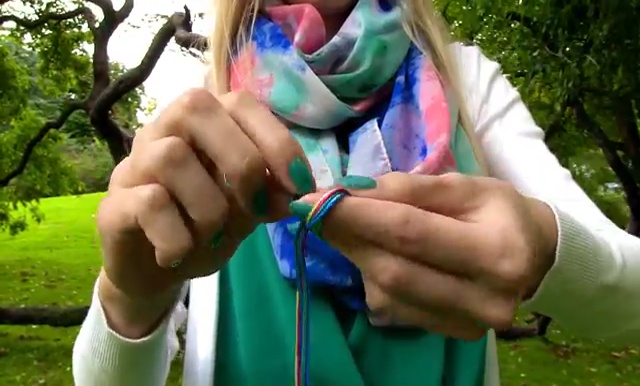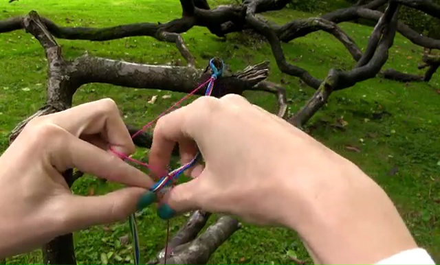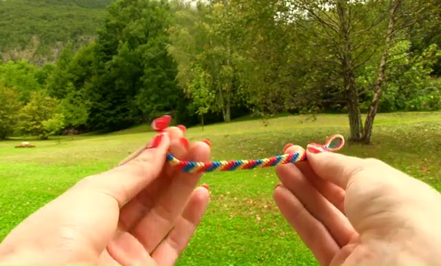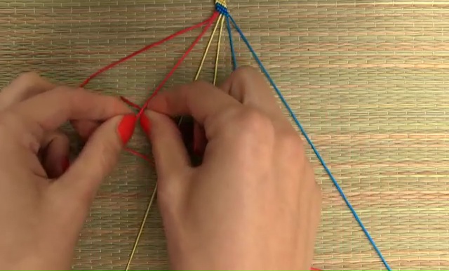 - Take the outside string on the left and mold over all other 5 strings on the right side, make a 4-word knot by creating a 4 shape over the second string, slip the loop of the string under the second string and back through the opening until loop and tighten the knot. Keep knotting like this and keep changing string colors one by one till the end of your string. Always make two forward knots over each string.