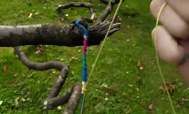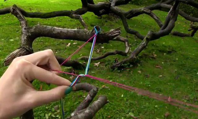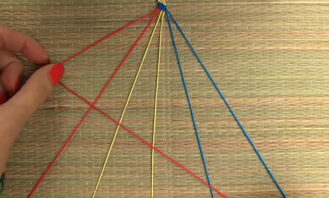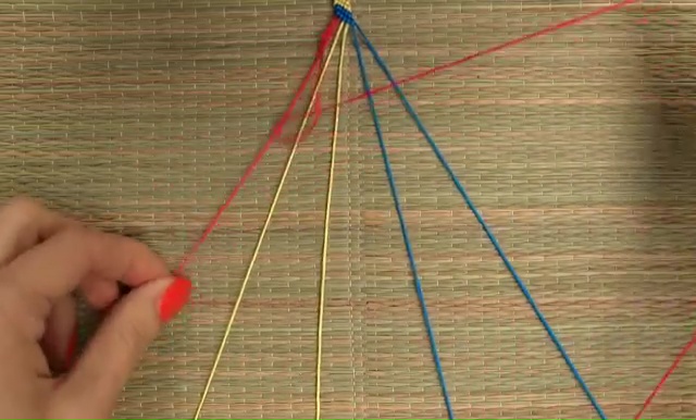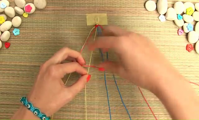 - Set the loop on a strong surface and start to make the knotting. For that, you need to hold one of those strings, make a normal 4-word mark around the remaining 7 threads.