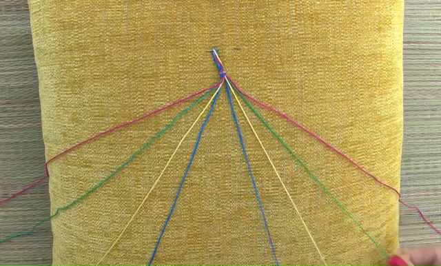 - Keep those strings together, fold them in half and knot in together. When the knot would be done, you will get 8 strings coming out from the knot, you can cut one off as we only need 7 of them!