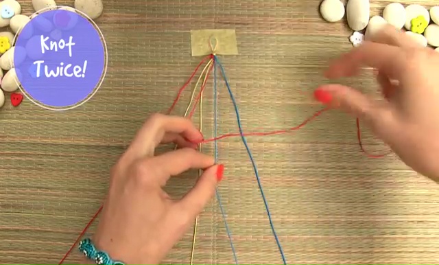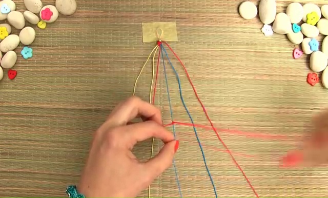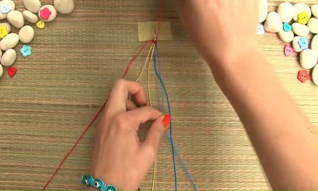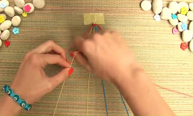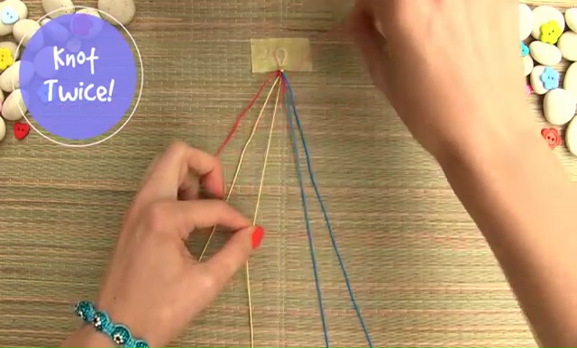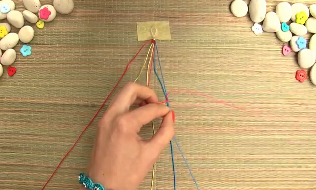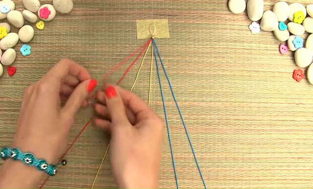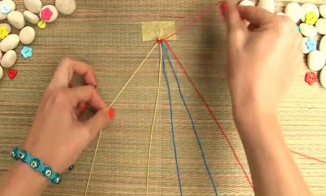 - We are going to use only 3 colored strings this time. Take about 8 inches of each thread, arrange them together and fold them again in half, make a knot as we did before, place the strings on a mat and set with a tape.