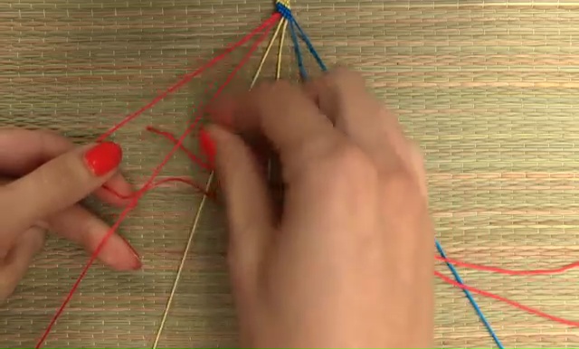 - Now, separate those 8 strings into two sets, one of a single color on each side, arrange them in a mirror image pattern.