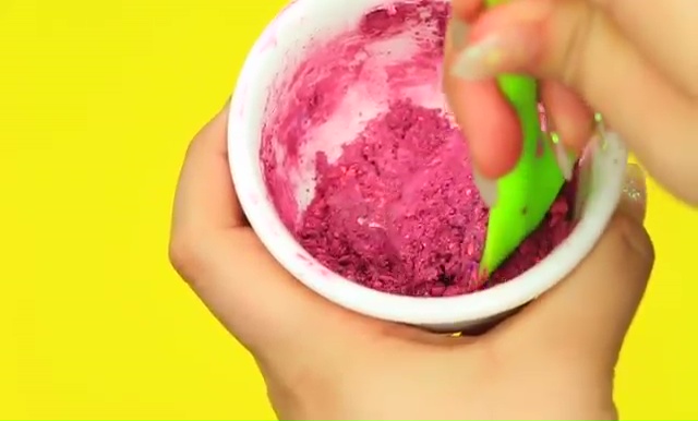 - At first, take some eye shadow pigments into the bowl as per your choice, we are taking some red, pink and purple colors to get an unequally different shade!