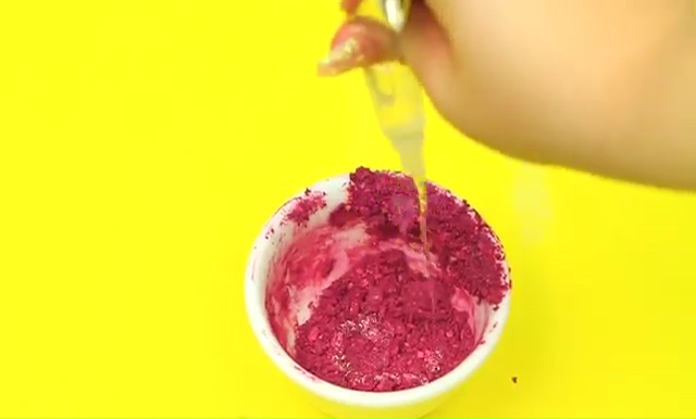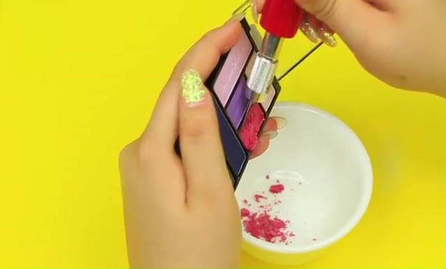 - When all the colors come into the smooth powder dust form, add lip gloss into the mix. Here we should mention that, if you want more matte shade in your lipstick you need to add more color, and if you want to get more glossy shade then, you have to add more gloss into your mix.