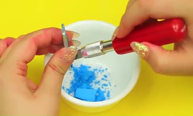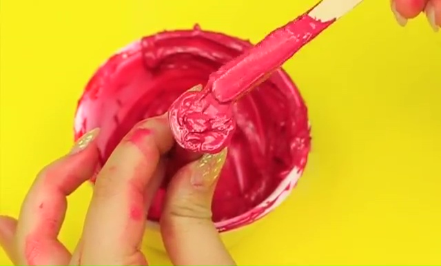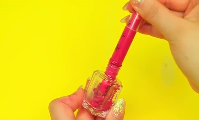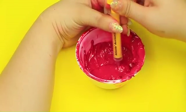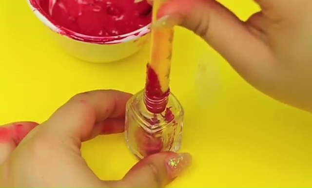- After that dip, the empty syringe into the bowl, fill it with your lipstick paste and pour in the empty nail polish container.